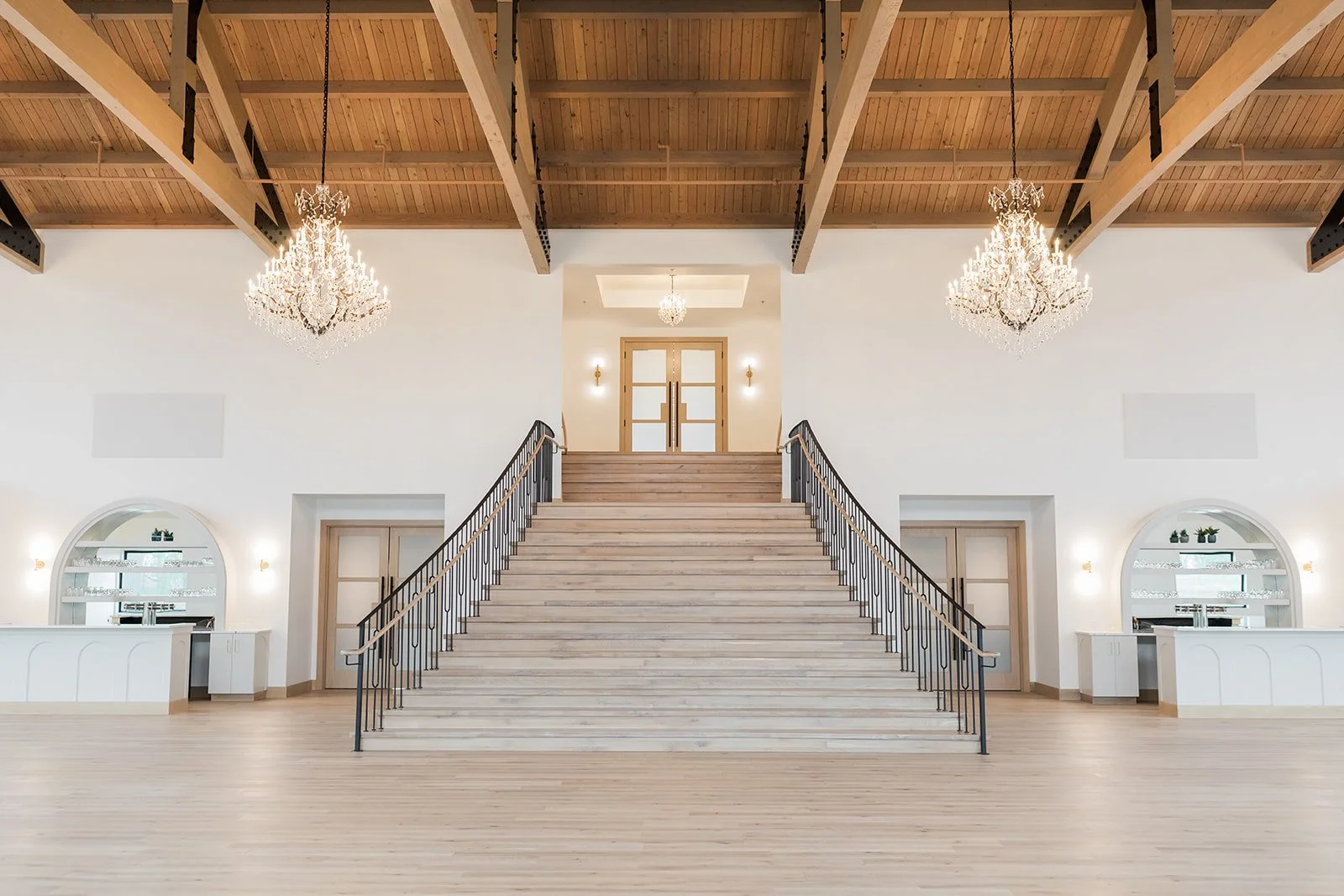 This is the heart of the venue—a bright, open space with floor-to-ceiling windows, exposed wood beams, crystal chandeliers, and a dramatic central staircase. With two built-in bars and a neutral color palette, it’s an ideal blank slate that supports any wedding aesthetic.