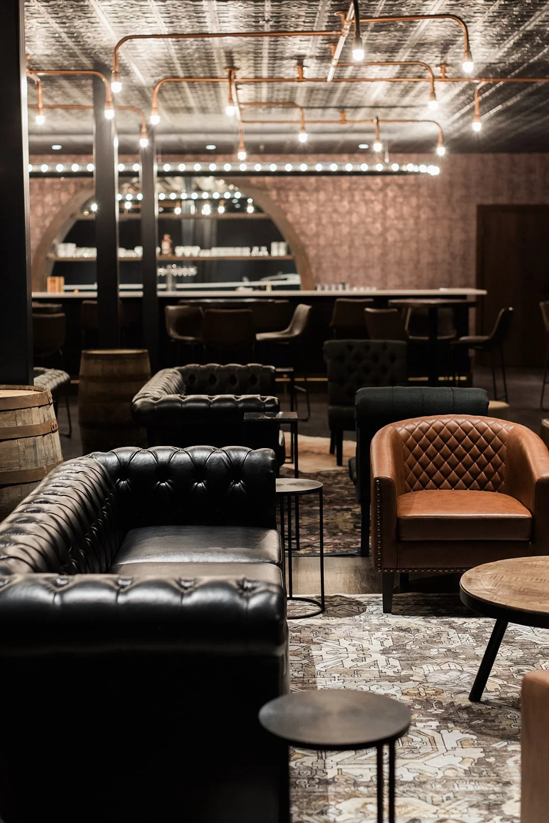 When guests enter the venue, they’re welcomed into the tasting room—a cozy, moody space featuring a fireplace, stylish seating areas, and a mirrored bar with the venue’s logo. It’s a natural first impression moment and a great space for gathering early in the day or during transitions.