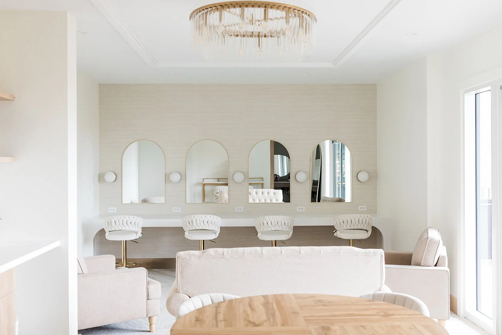 Flooded with natural light, the upper level includes two getting-ready suites with a shared lounge space under a skylight. Whether you’re prepping with your wedding party or taking a quiet moment before the ceremony, this area is beautifully styled and fully functional.